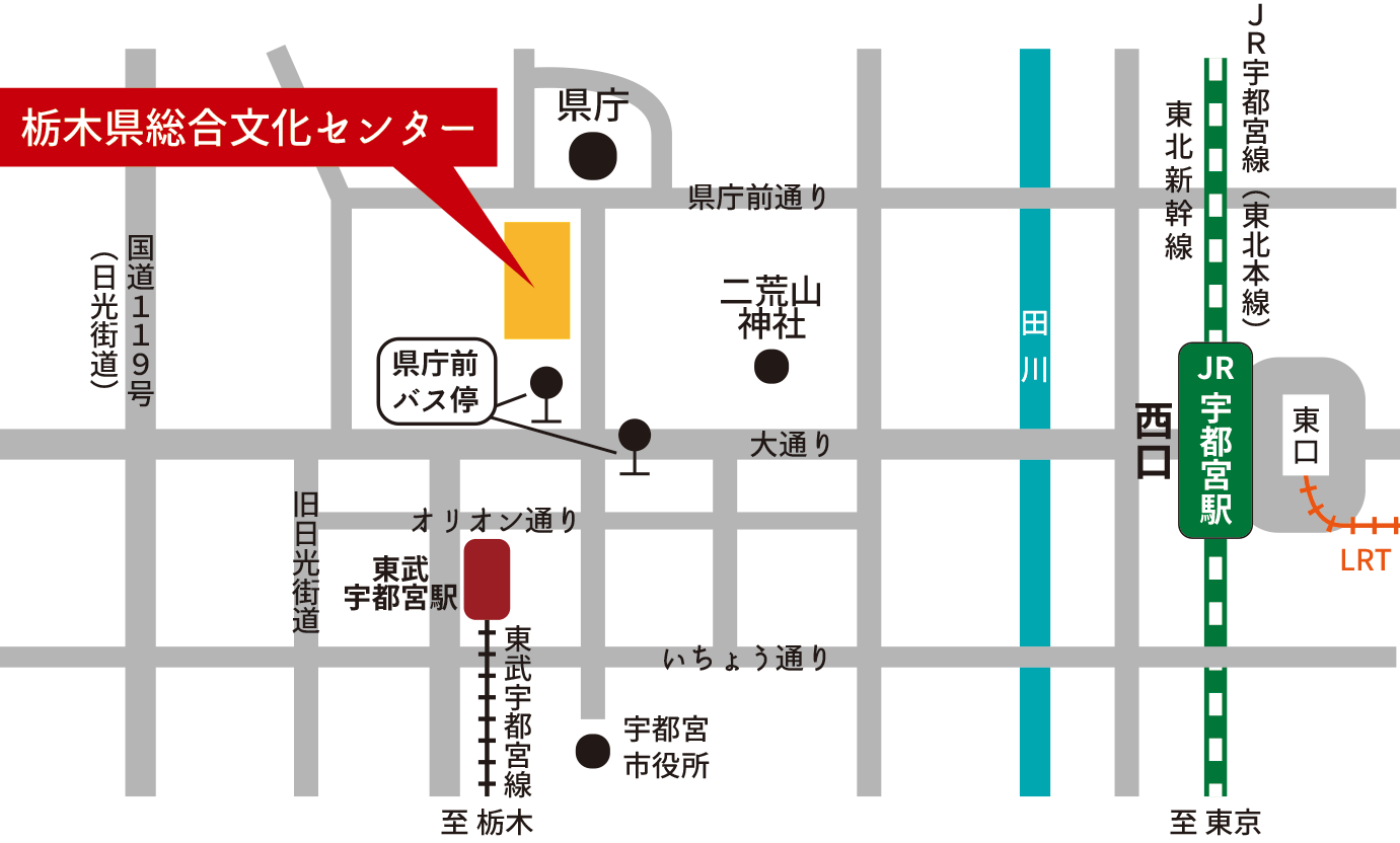東武宇都宮線:東武宇都宮駅下車ー徒歩で約10分(約700m)